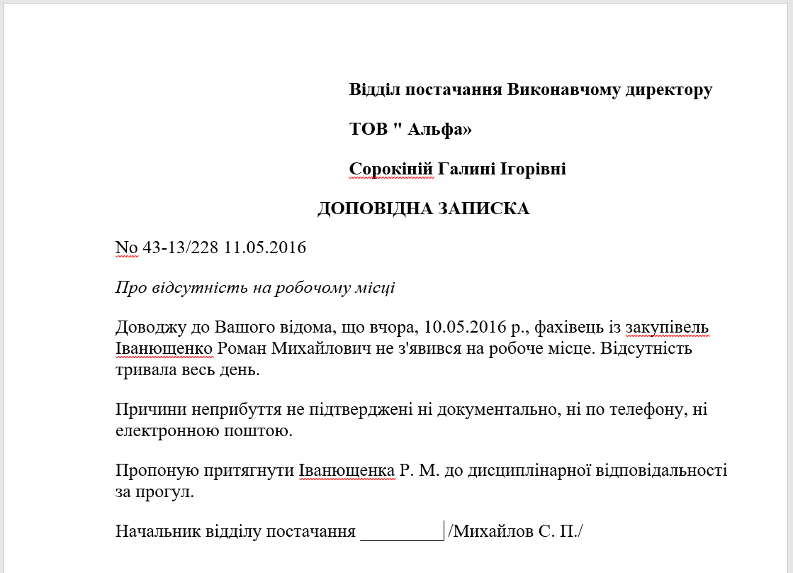 Наведемо приклад доповідної, яка фіксує прогул робітника:
