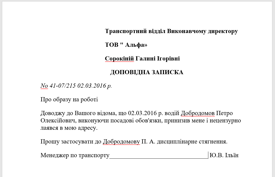 В документі можна не тільки констатувати факти, а й викласти пропозиції, що повинно зробити керівництво. Слід правильно оцінити проступок та покарання – не кожне діяння слідує звільнення.