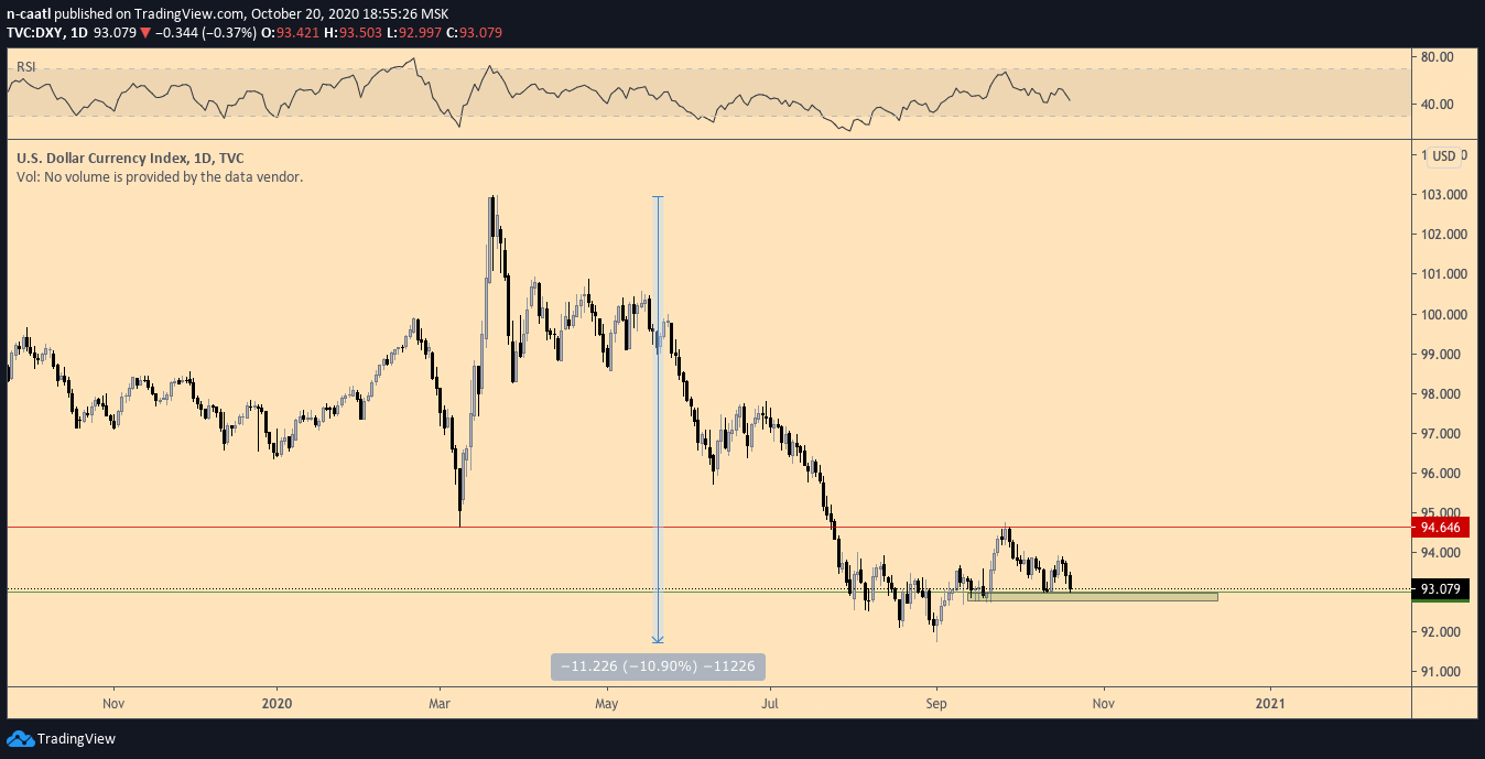 Последняя поддержка, отделяющая доллар от продолжения нисходящего тренда, находится на уровне 93 пунктов. В случае ее пробоя новые минимумы для индекса доллара неизбежны, а биткойну это только добавит восходящего импульса.