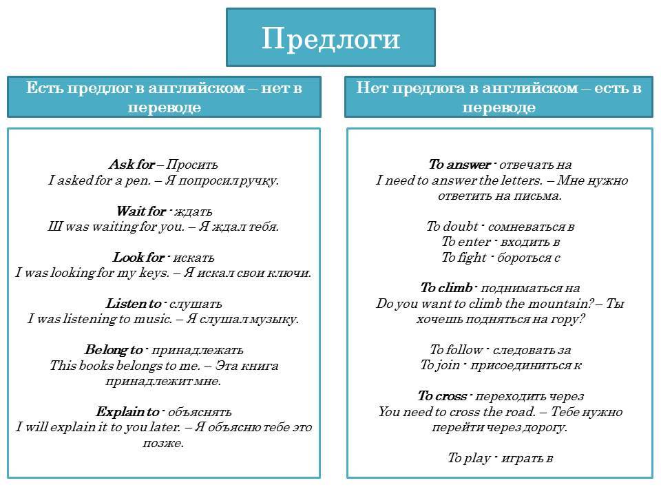 Кстати, в английском языке есть такие предлоги, которые могут не найти своего «братца» в русском языке. Перевести их не получится, а вот запоминать устойчивые выражения наизусть придется. На этот случай у меня для вас есть таблица, где вы можете увидеть примеры таких выражений. Настоятельно рекомендую вам их выучить! Как? Просто посоставляйте с ними предложения и прочувствуйте разницу.