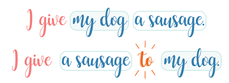 Уже упоминавшиеся выше дополнения могут возникать в предложении несколько раз. Дополнения бывают прямые, как наша сосиска (то есть непосредственно объект, на который направленно действие) и косвенные (объект, на который направленно действие через прямое дополнение). Косвенное дополнение может стоять перед прямым, а может после: Я даю своей собаке сосиску. I give my dog the sausage или I give the sausage to my dog. В обоих предложениях the sausage – прямое дополнение, а my dog – косвенное. И если косвенное дополнение оказывается в конце предложения после прямого, ему нужен предлог to.