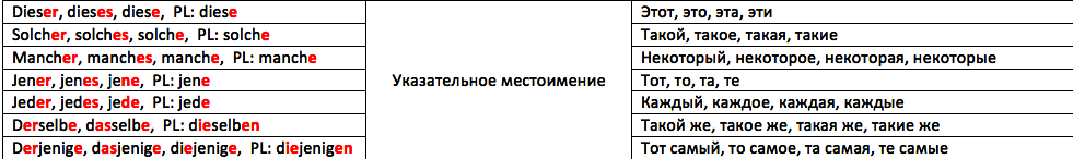 В зависимости от рода и числа мы выбираем нужное нам местоимение и ставим его в подходящую форму. Склонение данных местоимений идентично склонению артикля немецкого языка.