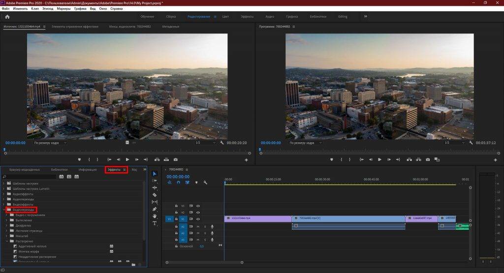 При желании вы можете украсить склейки между фрагментами ролика различными эффектами — видеопереходами. Для этого на панели «Проект» найдите вкладку «Эффекты» и в появившемся списке нажмите на «Видеопереходы». Попробуйте разные и выберите подходящие. Чтобы применить эффект, просто перетащите его с панели «Проект» на границу между двумя отрезками ролика.