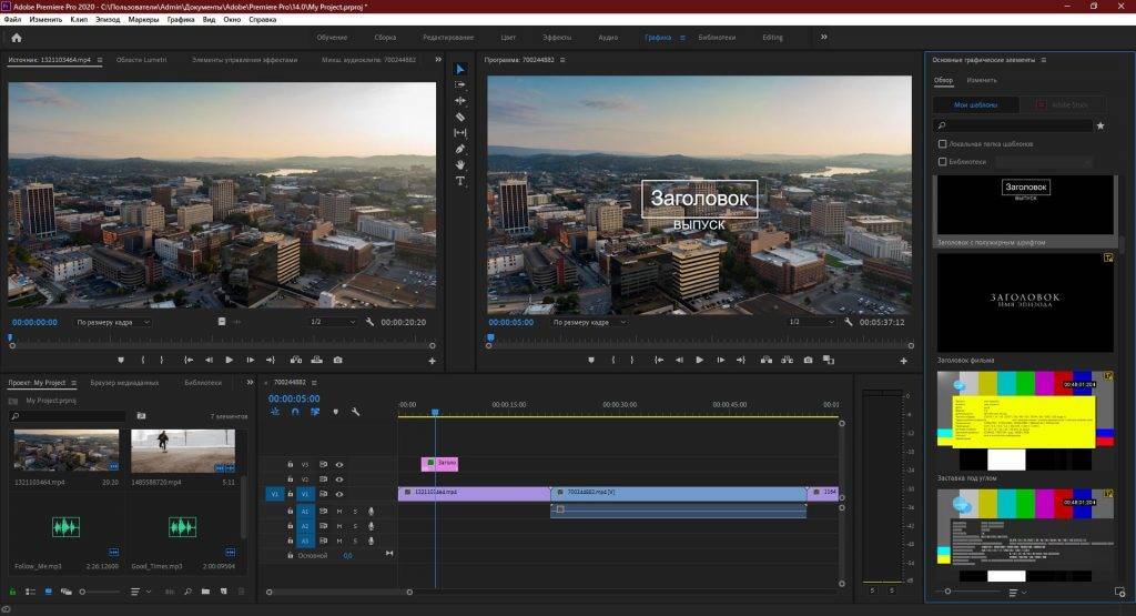 Если вам нужно добавить в видео имена авторов, цитаты или любой другой текст, кликните на пункт «Графика» в верхней части окна. Выберите подходящий шаблон титров на панели справа и перетащите его на временную шкалу. Введите нужный текст на панели «Программа».
