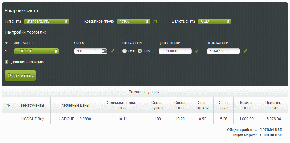 Что мы видим? Мы выбираем сделку по той же валютной паре, что и выше. Объем сделки один лот, т.е. 100 000 долларов. При выбранном кредитном плече 1:100 требуемый для сделки депозит равен 1 000 долларов — он указан справа внизу в графе «Общая маржа». Стоимость пункта в 10.11 $ рассчитана по формуле выше. Разница между ценой открытия и выбранной ценой закрытия сделки составляет 0.0591 или 591 пункт. Перемножением 10.11 $ на 591 пункт получаем нашу прибыль.