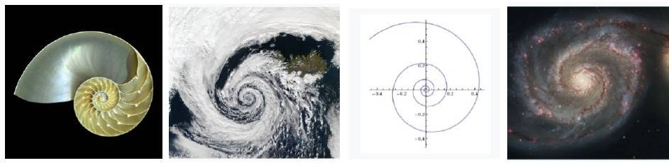 Логарифмическая спираль: раковина Наутилуса, атмосферная, математическая, космическая.