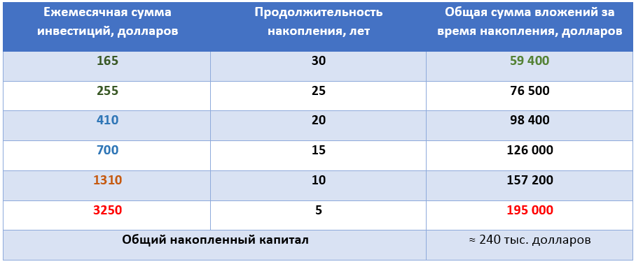 Тысяча долларов в месяц это 12 000$ в год. Если мы рассчитываем ежегодно получать 5% с исходного капитала, то он должен составить 240 000$. Серьезно. Известно, что историческая доходность фондового рынка США за 200 лет около 10% в год, с учетом инфляции порядка 8%. Посчитаем, какие суммы при такой доходности необходимо ежемесячно вносить инвестору, чтобы превратиться в рантье: