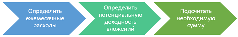 Последним пунктом будет подсчет необходимой суммы стартового капитала. Для этого разделите необходимую сумму заработка на ожидаемую доходность, выраженную в процентах. Например, каждый месяц Вам необходимо получать 25 000 рублей (то есть 300 тысяч в год), а ожидаемая доходность капиталовложений равна 5% годовых. В таком случае требуется 6 млн. рублей (300 000 : 5%) рублей стартового капитала. Лучше закладывать скромный процент доходности, поскольку реальность как правило хуже даже умеренных ожиданий.