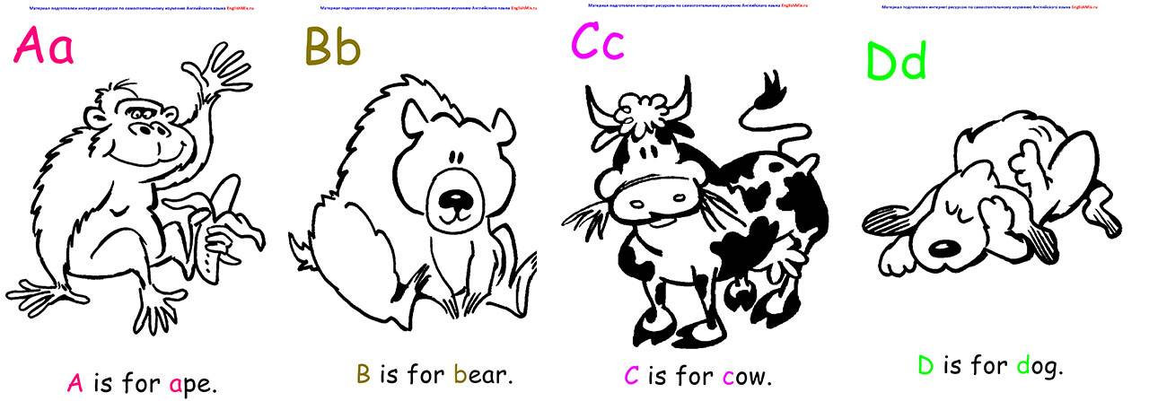Изображение предмета или зверька рядом с изображением буквы позволяет выработать устойчивые ассоциации. Показывая картинки, следует правильно произносить название предмета на английском языке, и звучание буквы. Запоминание должно начинаться с правильных звуков