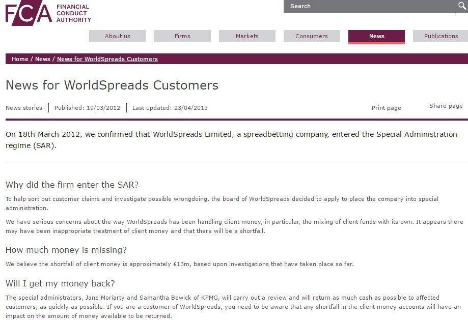 FSA опирался на отчеты аудитора, игнорируя необходимость собственноручной проверки брокера. Примечательно, что информации о том, поступали ли жалобы от трейдеров, нет. Потому можно сделать вывод, что брокер WorldSpreads умело маневрировал деньгами клиентов, а FSA проверял его только лишь формально.