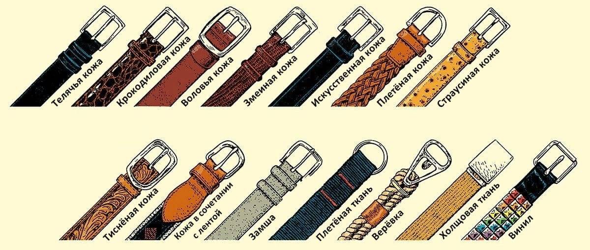 Натуральная кожа. Не считая экзотических видов, для изготовления качественных ремней обычно используется воловья или телячья кожа. Это наиболее востребованный, традиционный материал, уместный в любом комплекте. Причём возможны два варианта исполнения: