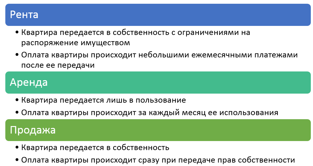 Также в качестве плательщика могут выступать разнообразные организации. Тоже очень распространенный вариант. В России сейчас даже есть специальные центры, которые производят рентные платежи и вообще заключают наши сегодняшние типы соглашений, чтобы потом получить в собственность имущество. Речь обычно идет о квартирах и домах.