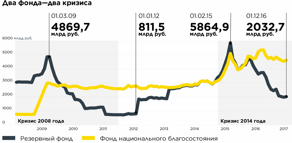 Два пика соответствуют времени девальвации рубля — и так как девальвация конца 2014 года была сильнее, чем в 2009, то и рублевая капитализация фонда оказалась максимальной в начале 2015 (тогда как в долларах средств было заметно больше в 2009). Т.е. начальная фаза кризиса даже приводила к росту рублевых активов, однако затем следовал сильный спад. К 1 декабря 2016 года в фонде было чуть более 2 трлн. рублей или примерно 35 млрд. долларов — но уже к началу 2017 года эта сумма уменьшилась вдвое до 1 трлн. рублей (17 млрд. $). Который и был потрачен в конце 2017 года, сведя баланс фонда к нулю.