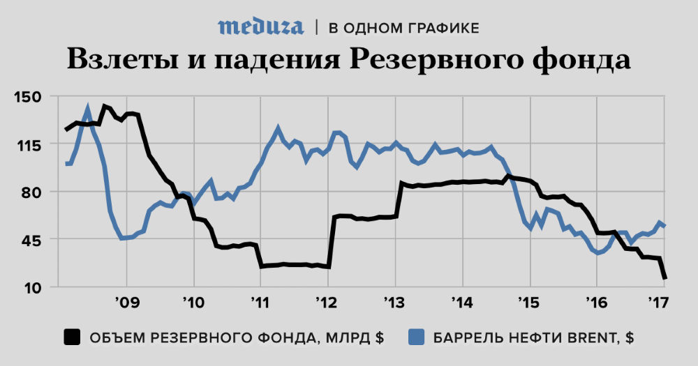 На нем видна заметная корреляция объема резервного фонда с курсом нефти. Когда в период мирового кризиса 2008-09 годов нефть резко пошла вниз, это с небольшим опозданием отразилось и на Резервном фонде. Однако если в начале 2009 года нефть начала восстанавливать прежние позиции, то фонд продолжал активно уменьшаться и к 2011 году сократился более чем в 6 раз до 20 млрд. долларов. И если бы не высокая цена на нефть в то время, то его история могла бы быть заметно короче. Но благодаря ценам на уровне 115 долларов за баррель фонд еще смог вырасти в 4 раза, перешагнув за 80 млрд. Вторая волна падения нефти с 2014 года, наложенная на санкции, оказалось уже критической.