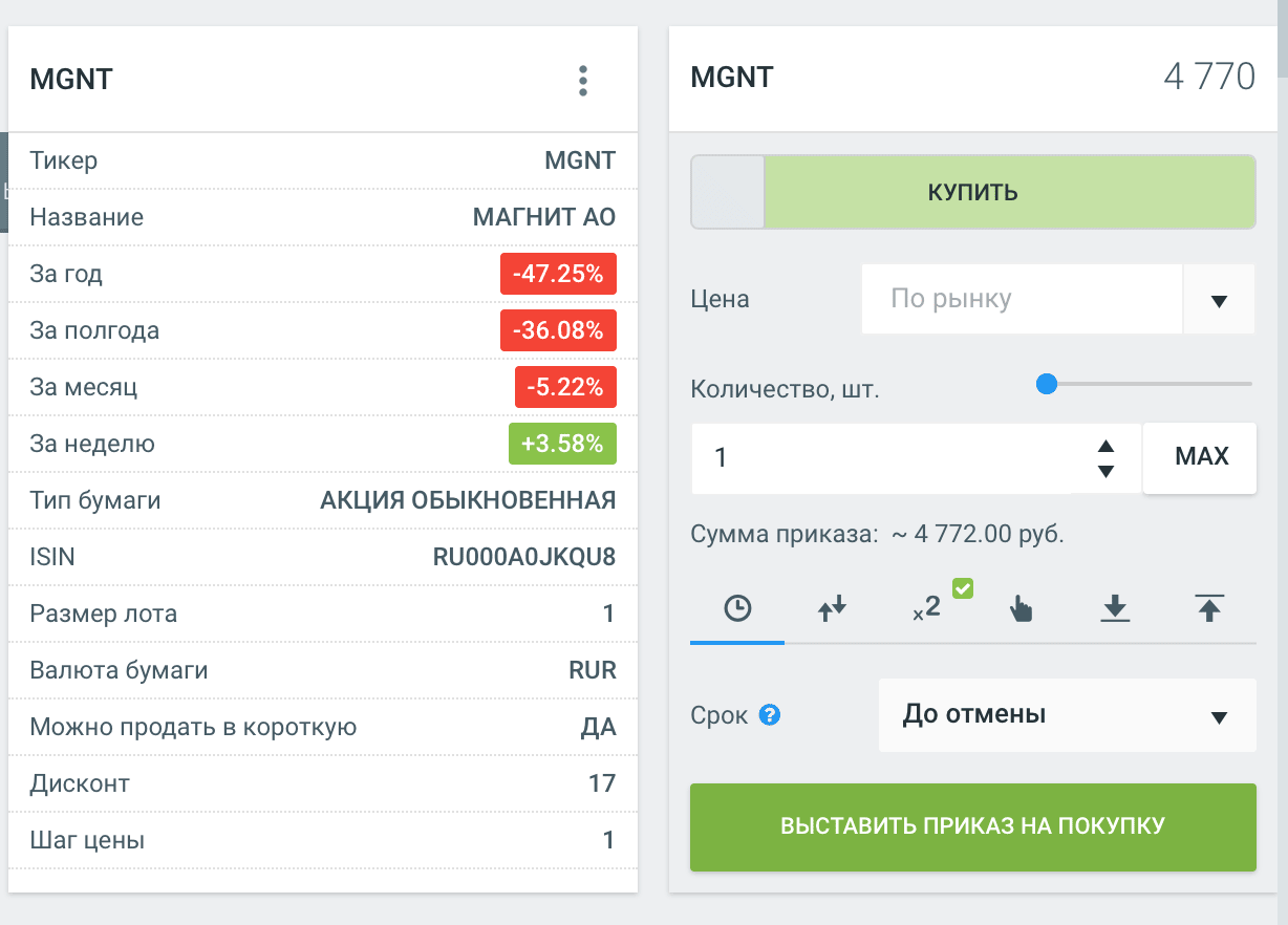 Рыночная заявка: покупаем лот акций «Магнита» по рыночной цене