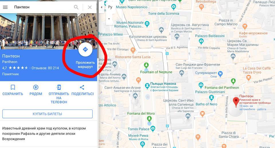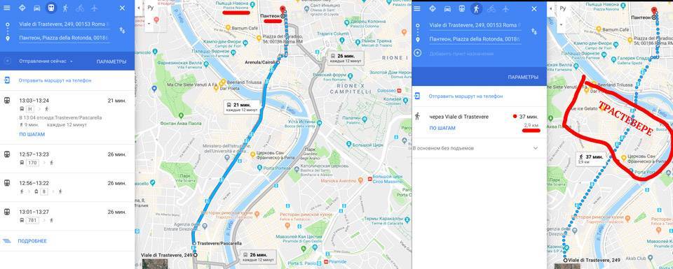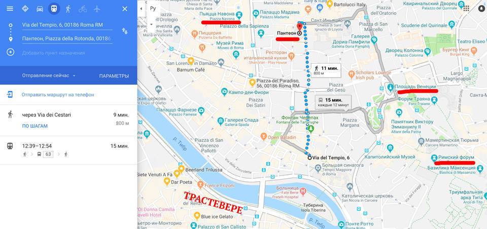 Нажимаете ПРОЛОЖИТЬ МАРШРУТ и вводите адрес вашего отеля. Гугл сразу покажет вам на карте все варианты, как добраться. Видим, что пешком до Пантеона идти всего 800 метров, а в другую сторону через реку начинается район Трастевере. Все бары и рестораны в Трастевере сосредоточены как раз в кварталах вдоль реки.