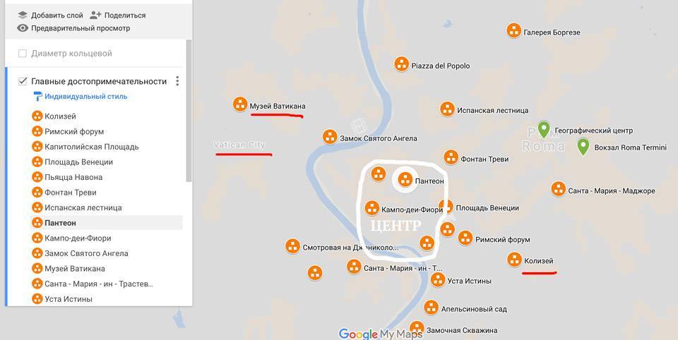На карту ниже я нанес главные достопримечательности, которые сразу приходят на ум. Уверен, даже если вы никогда не были в Риме, то слышали о них на уроках истории или в кино – Колизей, Пантеон, Ватикан, фонтан Треви, Римский Форум, Испанская лестница и так далее…