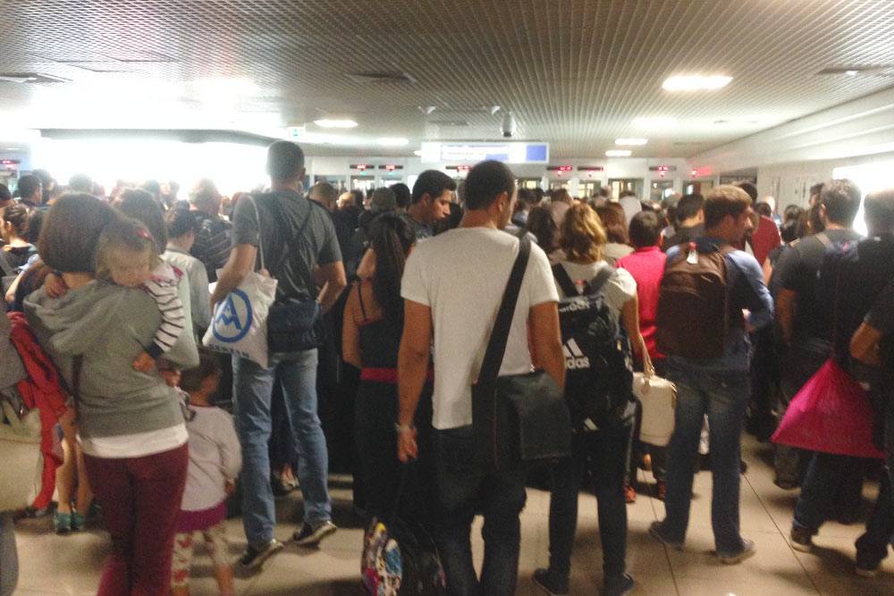 Очередь на паспортный контроль. В небольшом помещении 200 человек и всего две работающие кабинки