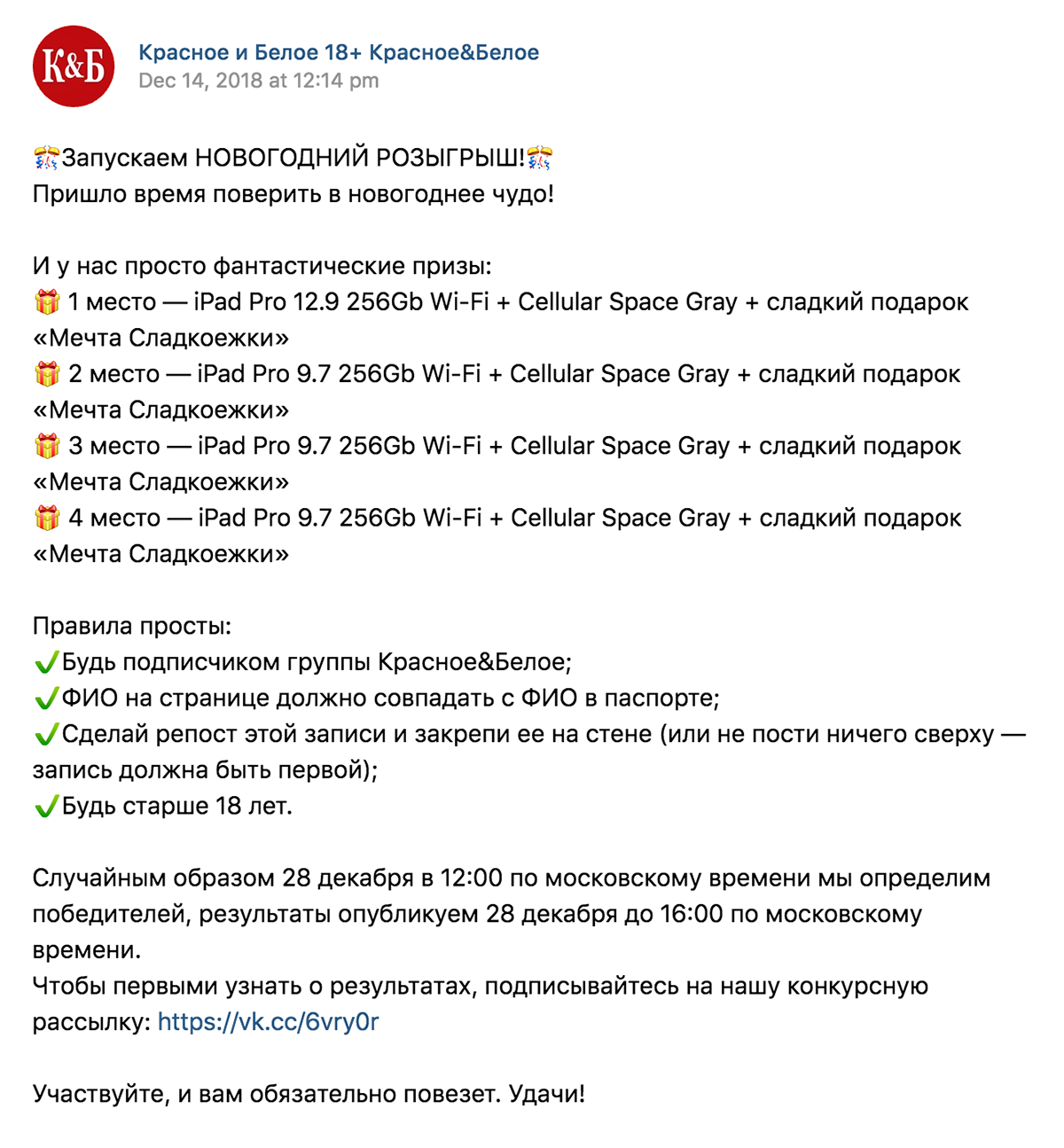 Чтобы стать претендентом на приз, вам придется вступить в группу, а потом сделать репост, поставить лайк или оставить комментарий. Одни организаторы попросят вас закрепить запись на стене в своем профиле, чтобы каждый гость вашей страницы увидел информацию о конкурсе. Другие не хотят отдавать выигрыш «призоловам» — то есть людям, чей профиль и так уже пестрит «призами за репост», — и тогда в условиях будут требования о максимальном количестве постов с розыгрышами, которое может быть у вас на странице.