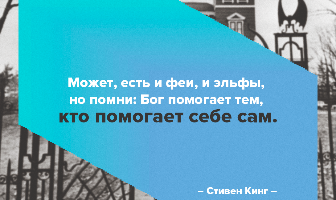 Немного религиозная цитата Стивена Кинга, однако суть он уловил прекрасно. Многие ждут помощи от космоса, удачи, различных фондов и даже правительства. Современными феями и эльфами, которые должны приносить мешки с золотыми монетами, могут выступать многие реальные организации вроде вузов. Выпускник думает, что у него красный диплом, его обучили, а значит, на его голову вскоре посыпятся паровозы вакансий, но этого не происходит, ведь он понимает, что придется всего добиваться самому, а бумажка мало чем поможет. То же самое происходит в моменты полного отчаяния: мы молим высшие силы, чтобы они спасли нас, растеряв веру в самих себя. Но если ты не веришь в себя, то на кой черт тебе должен помогать условный Будда? Ты уже для себя всё решил.
