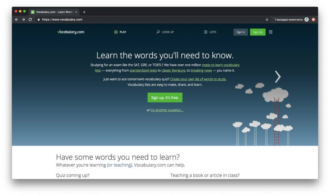 Отличный онлайн‑словарь, затерявшийся среди известных Oxford Dictionaries, Merriam‑Webster и Cambridge Dictionary. Плюс в том, здесь слова объясняют простым языком и с примерами из жизни. Прикручен неплохой онлайн‑тренажёр, много заготовленных коллекций слов. Сайт удобный и прекрасно работает.