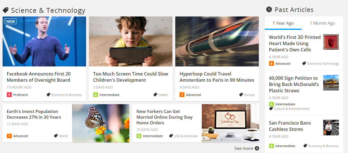 Как устроен. Статьи на сайте доступны в трех вариантах для разных уровней владения английским языком — Elementary, Intermediate и Advanced. В конце статьи есть список слов с пояснениями. Также статью можно прослушать. Их озвучивают носители языка, которые придерживаются среднего темпа речи.
