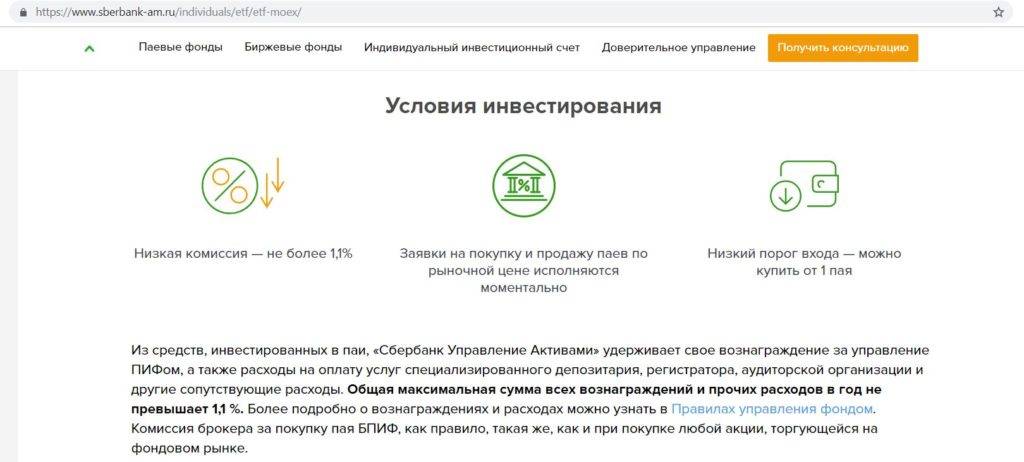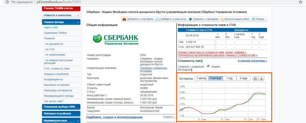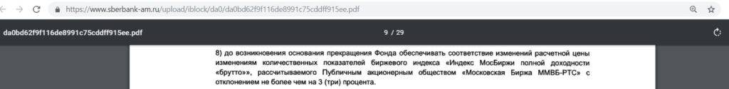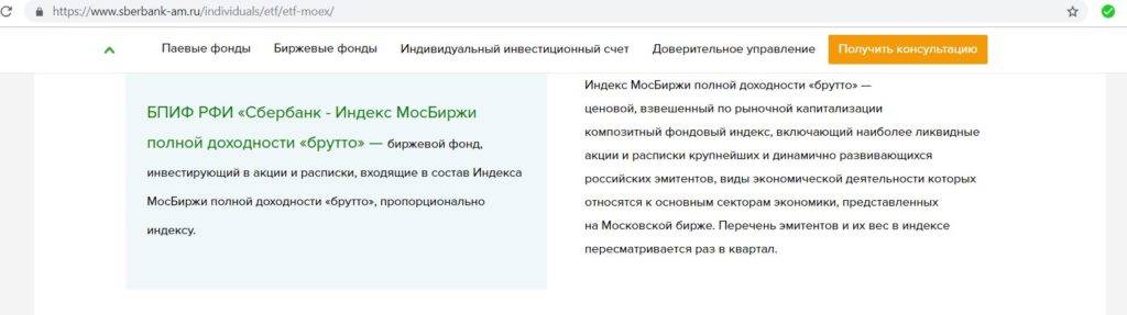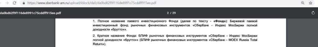 Полное название этого фонда «Биржевой паевой инвестиционный фонд рыночных финансовых инструментов «Сбербанк — Индекс МосБиржи полной доходности «брутто».