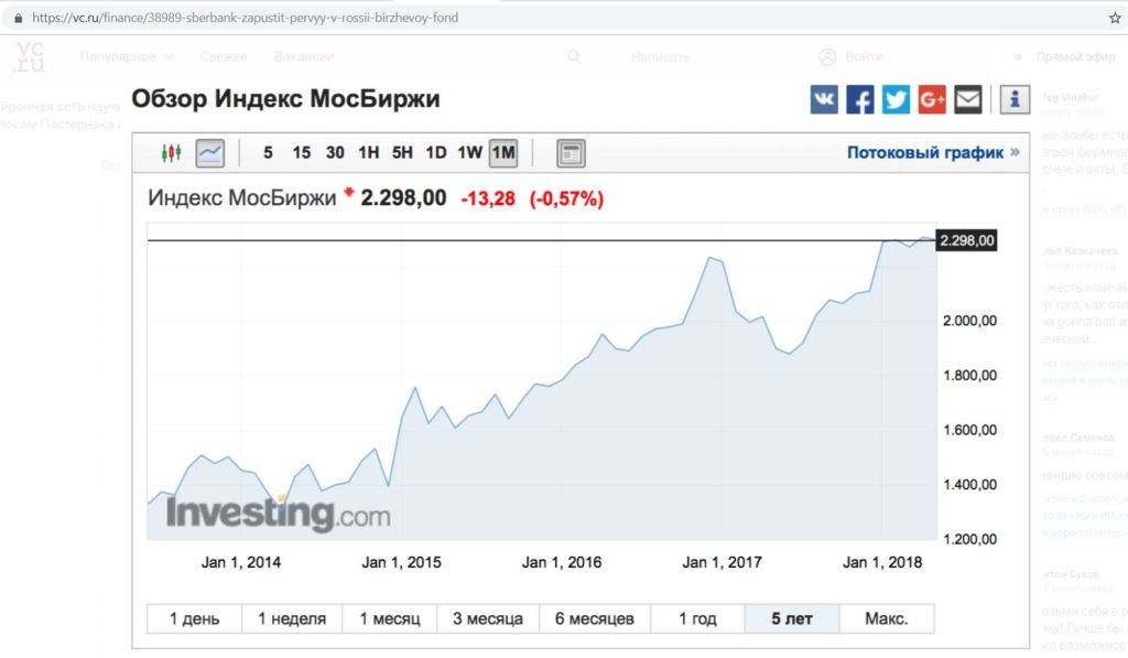 Вот график изменения индекса МосБиржи за 5 лет (раньше он назывался индекс ММВБ):