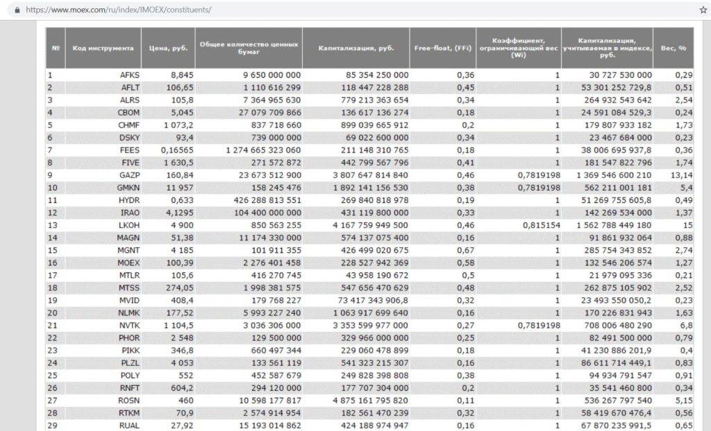 Ценные бумаги, которые входят в индекс, а также их процентное соотношение в портфеле можно посмотреть на сайте Московской Биржи: