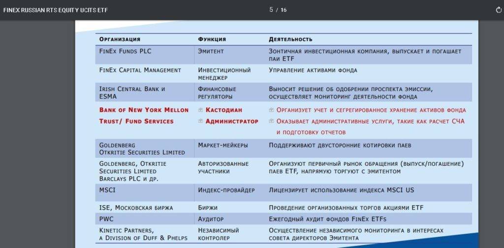 Механизм работы фондов от FinEx и ITI Funds гораздо сложнее БПИФ Сбербанка и включает много промежуточных звеньев, благодаря которым исключаются всевозможные ошибки и обеспечиваются гарантии сохранности инвестированных средств: