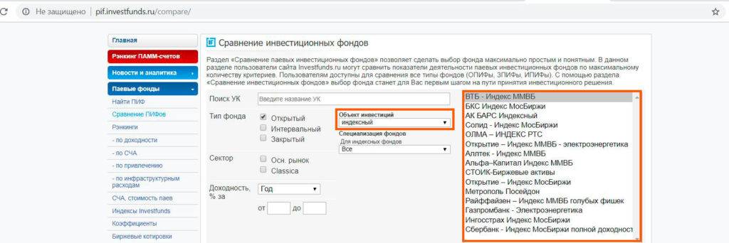Сравнивать ПИФы и БПИФ между собой удобно на сайте pif.investfunds.ru, там можно устанавливать свои критерии поиска. В графе «Объект инвестиций» я выбрал «Индексные». Как видим, ПИФы, повторяющие индекс МосБиржи, есть и у «ВТБ», и у «БКС», и у «Альфа Капитал», и у «Открытия», и у «Ак Барса» и т.д.