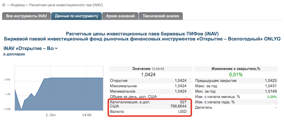 Инфу можно найти на сайте Московской биржи (на картинке ниже выделено красным). На данный момент объем фонда составляет чуть меньше 530 тысяч долларов. Или около 35 миллионов рублей.