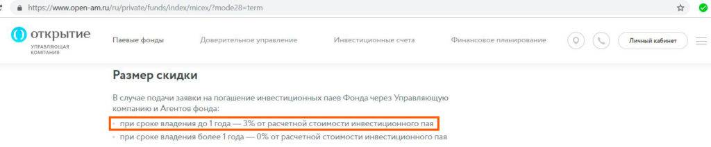 К тому же при операциях с открытыми ПИФами предусмотрены ещё различные надбавки при покупке и скидки при продаже паев. Например, помимо стандартной комиссии на содержание фонда в 1,55%, при покупке паев «Открытия» в офисе управляющей компании на сумму до 3 млн руб. предусмотрена надбавка в 1,3%, при покупке у агентов на сумму менее 50 000 руб. – 1,5%.