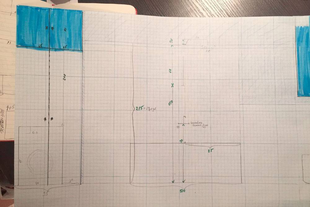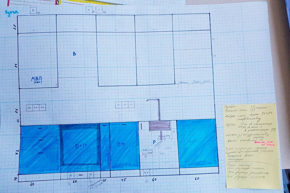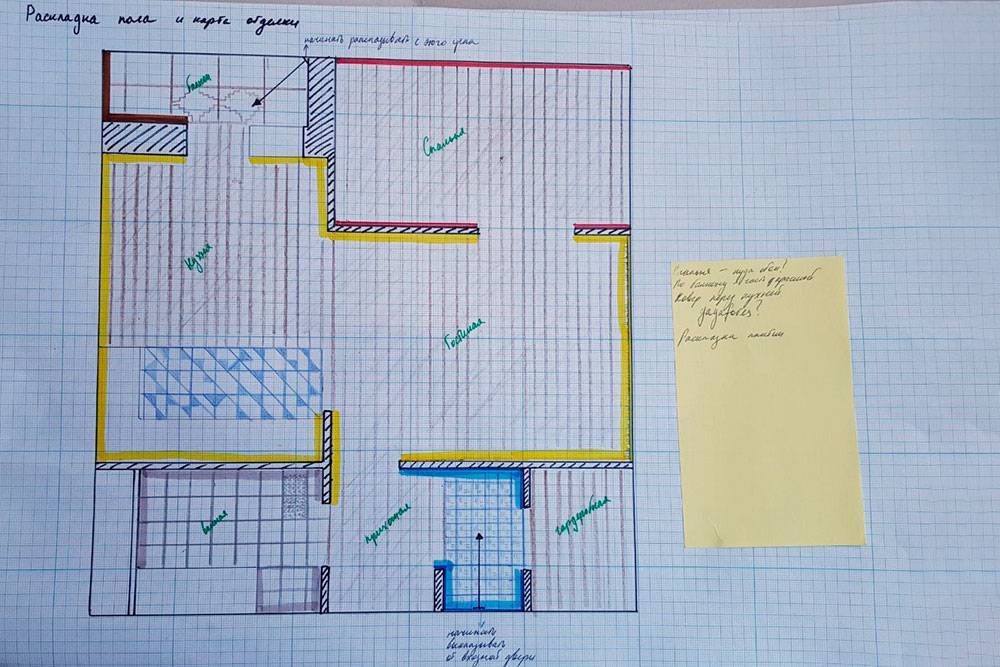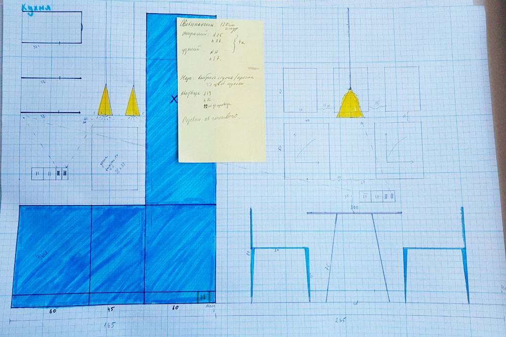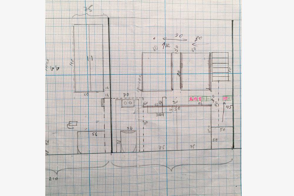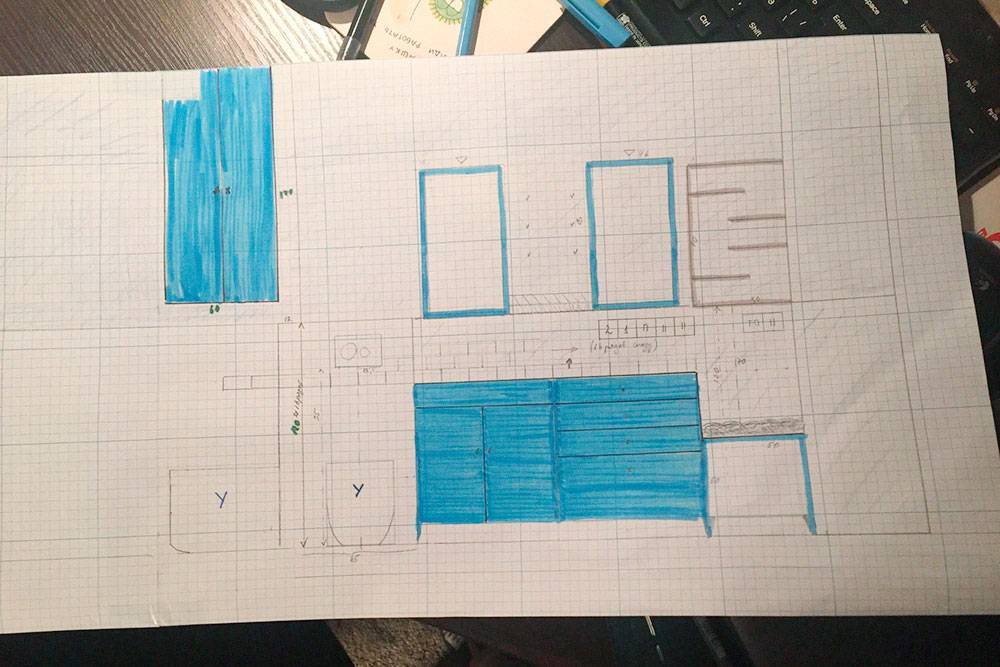 Профессиональный дизайнер создает чертежи в специальных программах на компьютере. Мы же рисовали всё от руки — потребовались линейка, миллиметровая бумага, цветные карандаши, гелевая ручка и рулетка. Для заметок и расчетов завели отдельный документ в «Гугл-таблицах». В него вносили вообще всю информацию, касающуюся ремонта, включая чертежи и картинки из интернета с интерьерами, которые нам понравились. Еще я советую все чертежи загрузить в телефон, чтобы они всегда были под рукой.
