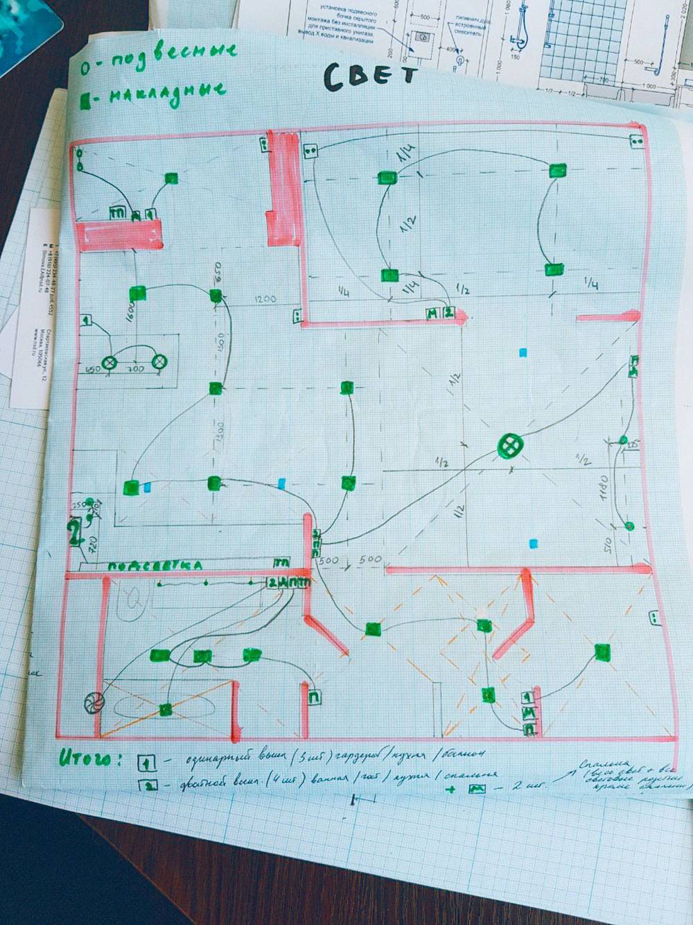 Помимо обычных люстр и встроенного света, мы делали вывод электропроводки под бра и световые подвесы. Для этого пришлось штробить стены — это тоже надо было учесть в схеме.