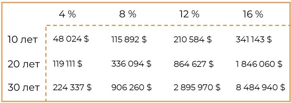 Главная особенность — дождаться, когда «сложные проценты» начнут приносить доход. Вот сколько можно заработать через 10, 20 и 30 лет, если вложить $100 тысяч:
