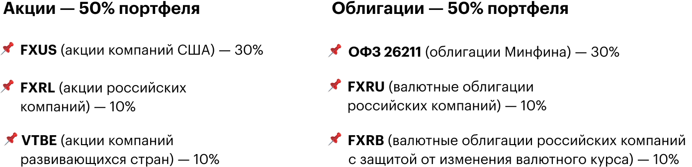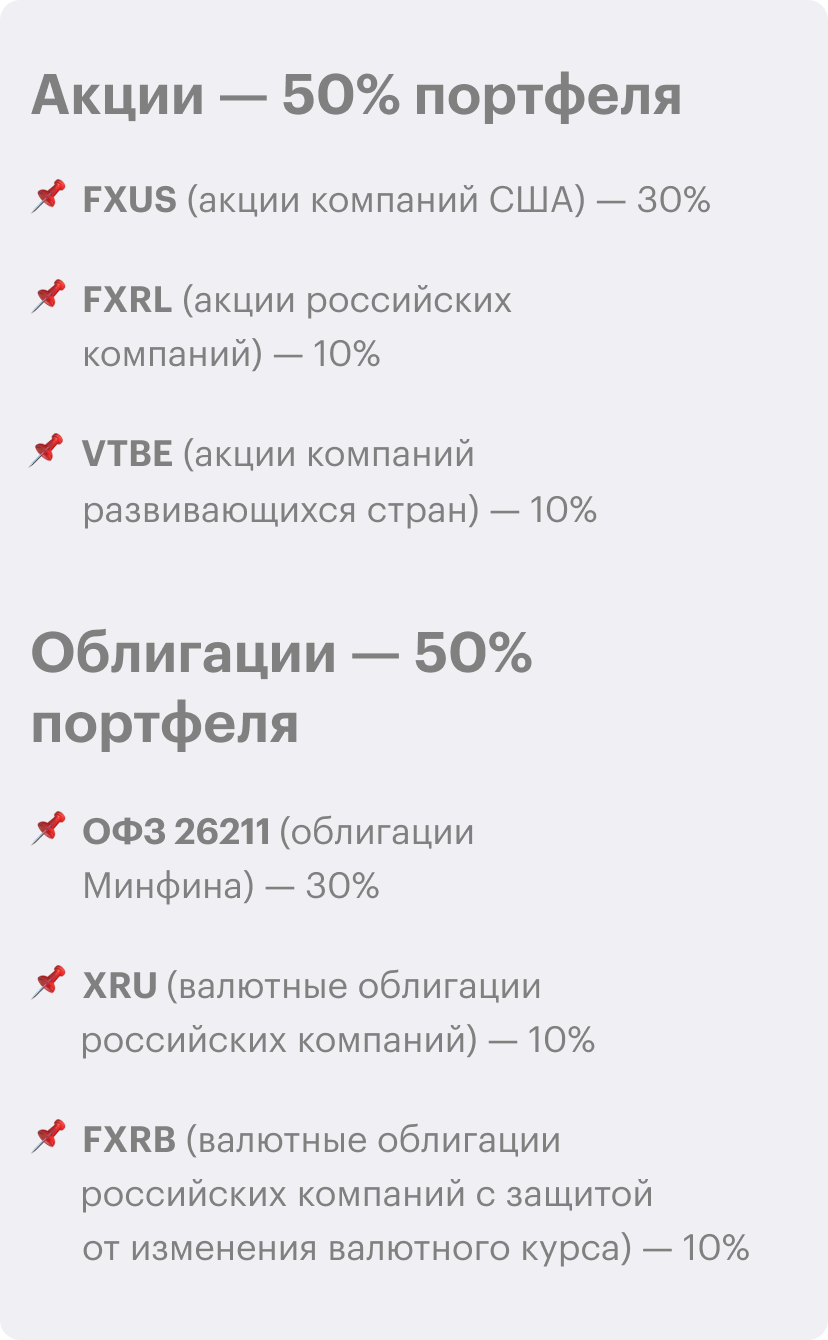 Советуем не ограничиваться российскими компаниями, а обратить внимание, например, еще и на акции компаний из США, Китая и других стран — для этого есть подходящие фонды. Что касается облигаций, то можно ограничиться российскими ОФЗ или бумагами регионов и крупных компаний