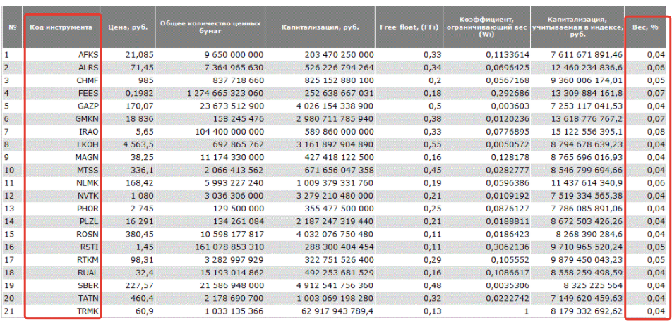 Нет такого сильного разброса по долям, как в классическом индексе Мосбиржи (кому-то выделяется доля в 10-15%, другим всего лишь 0,2-0,5%). И динамика всего индекса в основном зависит от горстки компаний с наибольшей долей. Типа Сбера, Газпрома и Лукойла. Которые в совокупности занимают более 40% веса всего индекса.