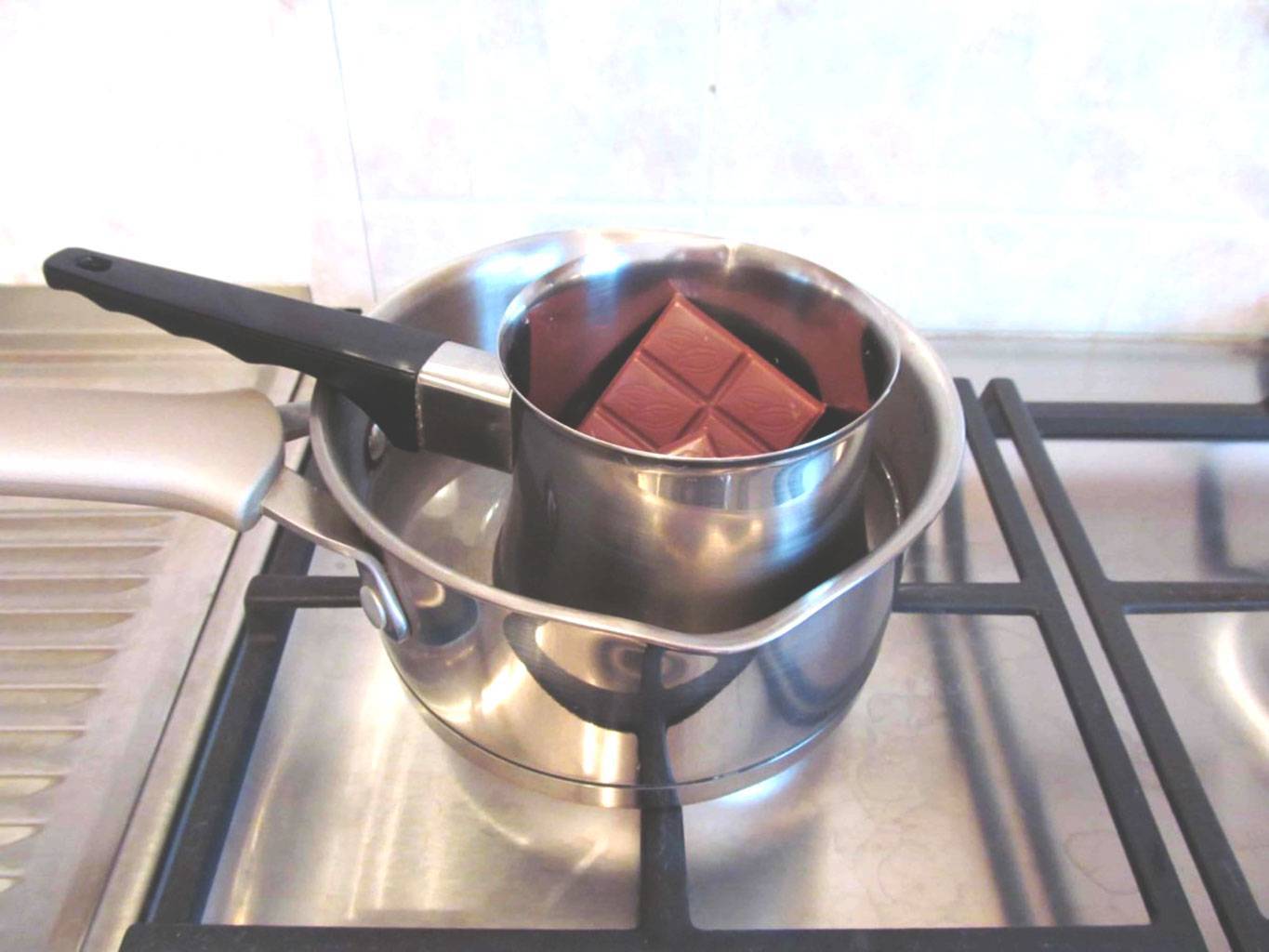 Водяная баня. Подготавливаем водяную баню так, чтобы верхняя миска не соприкасалась с водой. Делим шоколад на кусочки и ждем растворения примерно 80% всех частиц. Во время всего процесса постоянно помешивайте массу. Когда почти весь шоколад растопится, убираем его с нагревательного прибора и продолжаем мешать до абсолютного растворения всех частиц.