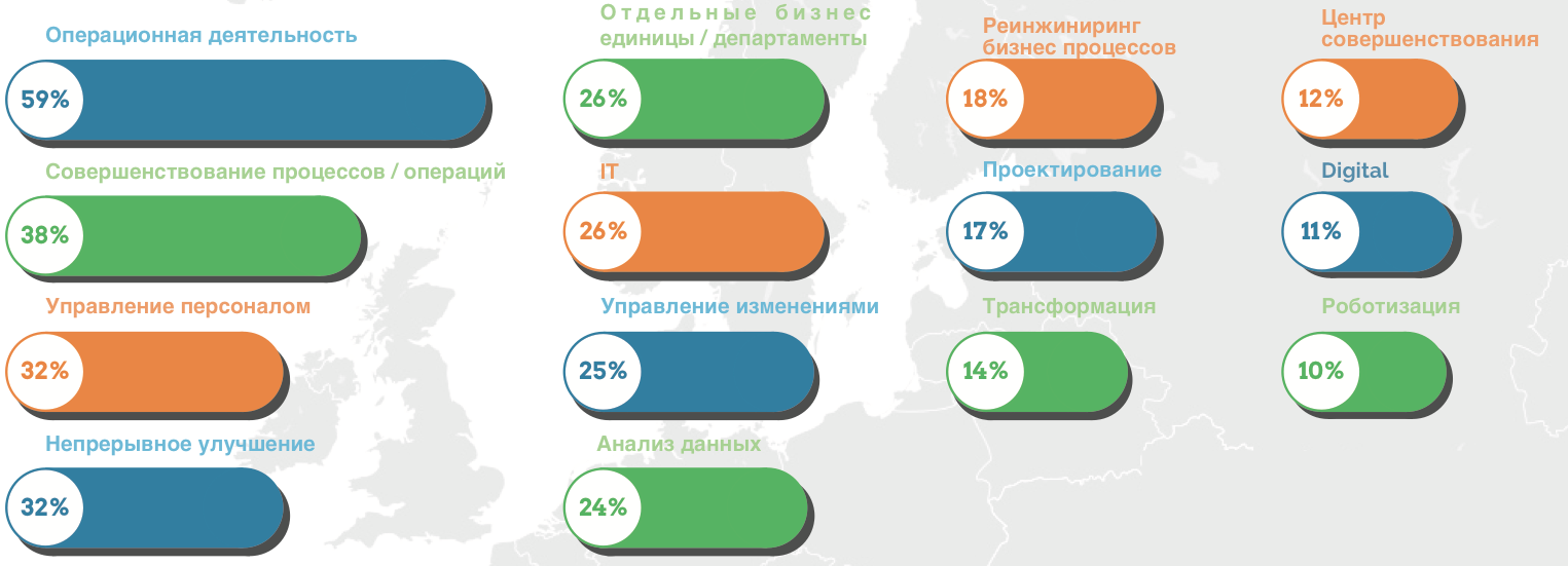 Более половины (55%) респондентов считают, что управление бизнес процессами (BPM) является наиболее предпочтительной методологией. Следующие 50% отдают предпочтение подходам Lean, Lean Six Sigma выбирает 41 %, а простую аналитику данных – 32 процента.