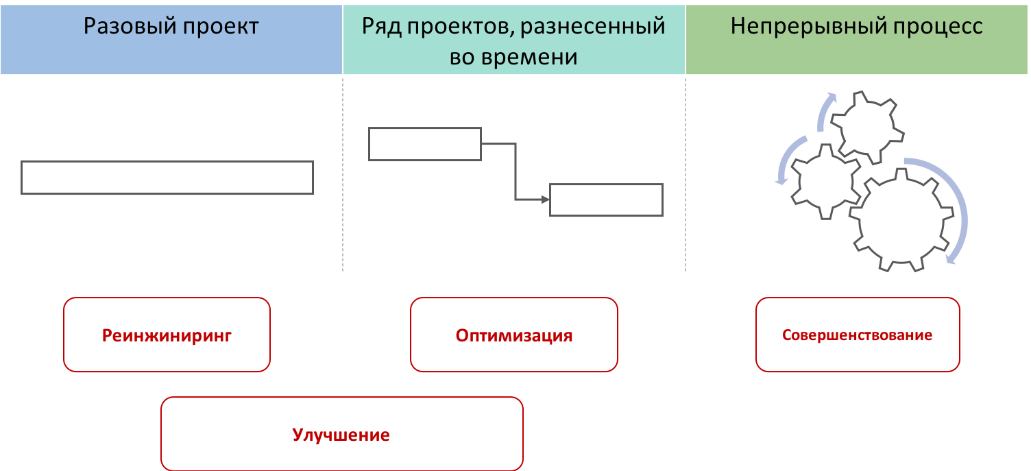 Оптимизация процесса – всегда проект или серия разнесенных во времени, проектов. Издали это даже может стать похожим на совершенствование бизнес процессов компании. Но только издалека. Как правило, в фокусе цели оптимизации находится 1-2 показателя процесса. И следующий проект по этому процессу будет рассматривать уже другие показатели. Участникам же проекта после завершения нужно время на стабилизацию достигнутых результатов.
