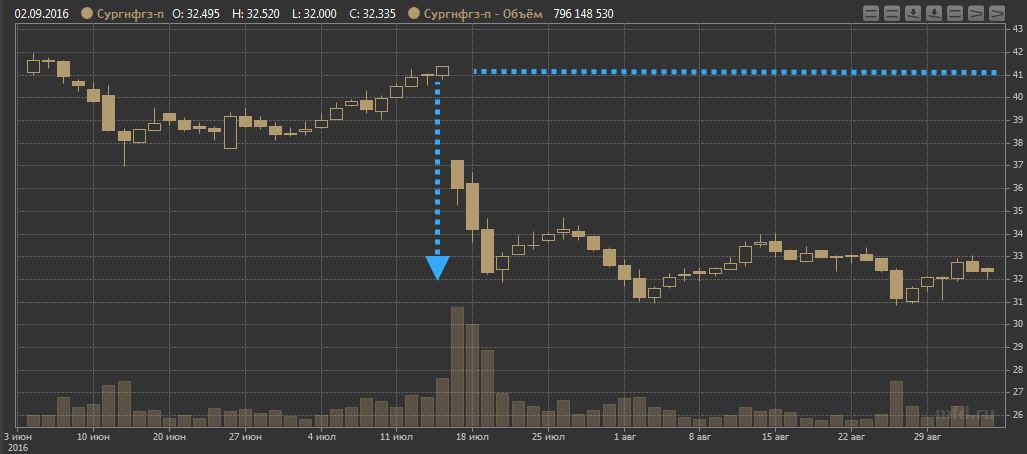 Итак, выше мы выяснили, что размер дивидендов и дата закрытия реестра под них становятся известны заранее, а купить акцию для получения выплат можно всего лишь за два дня до даты закрытия, продав ее на следующий день. Возникает довольно закономерный вопрос: нельзя ли купить акцию только на один день ради дивидендов? К примеру, «Сургнфгз-п» в 2015 году выплачивал 21.27% дохода, почти в два раза выше текущей ставки по депозиту — разве невыгодно воспользоваться такой возможностью?