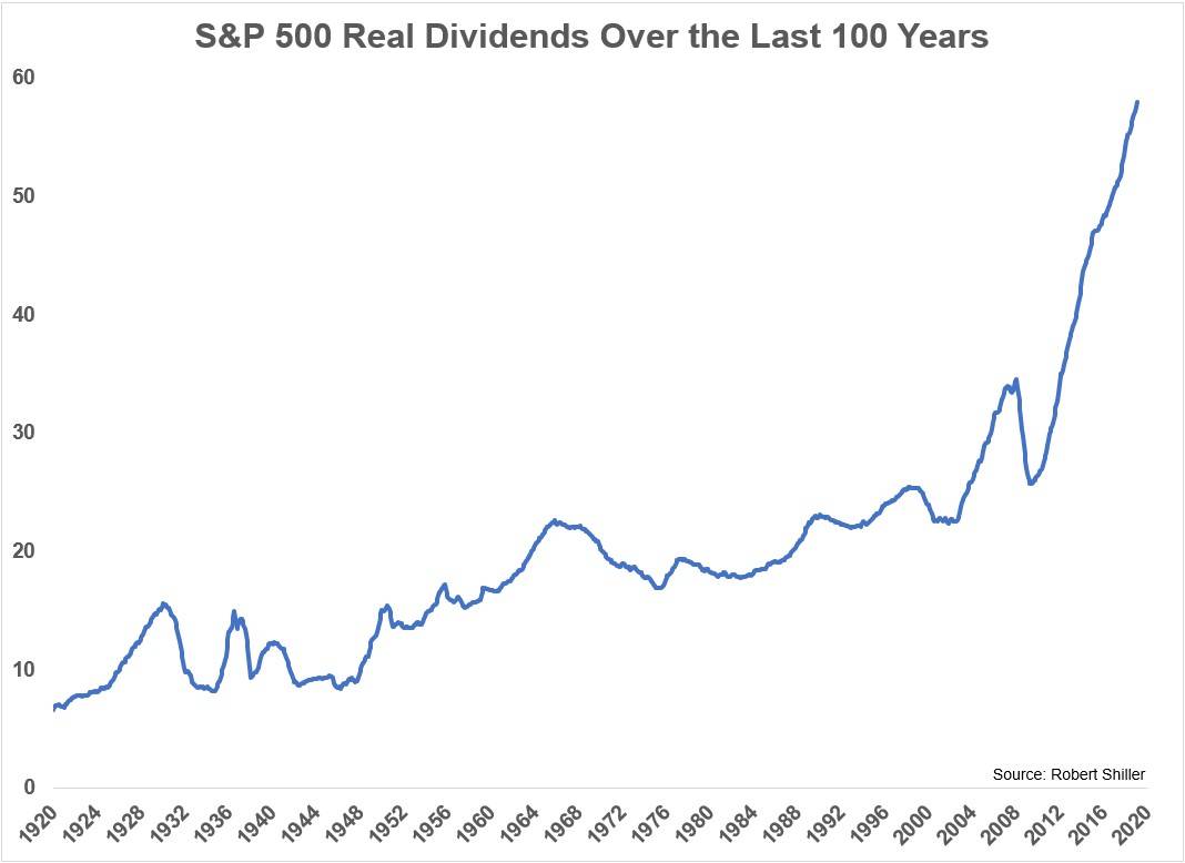 На графике ниже — изменение размера дивидендов за 100 лет (с 1920 по 2019 года). Очищенный от инфляции.