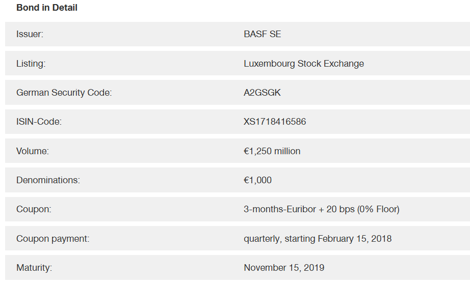 К примеру, корпорация BASF размещала двухлетние облигации с погашением в ноябре 2020 года с купоном, доходность которого формируется по формуле: 3-х месячная ставка EURIBOR + 20 базисных пунктов, т.е. 0,2%. Нетрудно подсчитать, что текущий купон получается отрицательным (вкладчику вернут меньше, чем он вложил) — тем не менее объем выпуска составил 1 250 млн. евро.