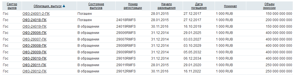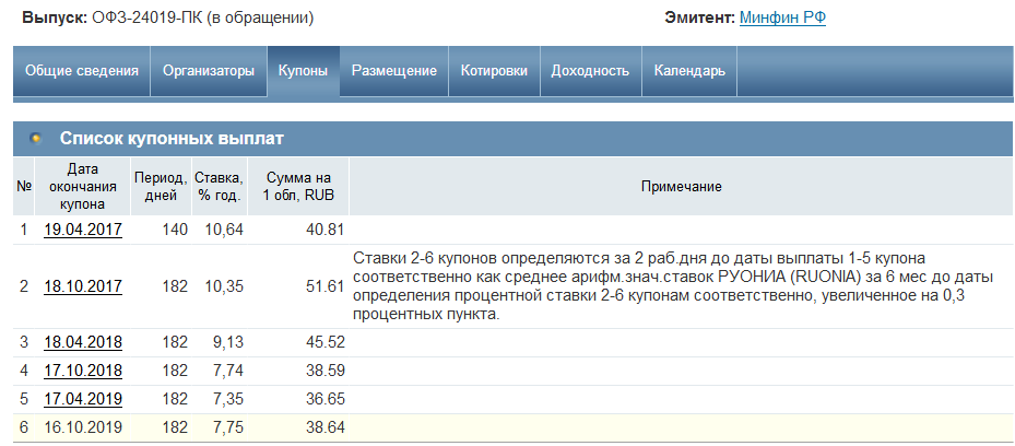 На скрине выше присутствуют 6 месяцев до даты определения ставки — иными словами, купон реагируют на текущую ситуацию с задержкой в полгода, так что менее подходит в случае, если облигация близка к погашению. Если же время есть, то данная облигация лучше работает с ростом процентной ставки, обеспечивая растущий купон. В настоящий момент в обращении находится восемь привязанных к ставке облигаций с датой погашения от 2019 до 2034 года: