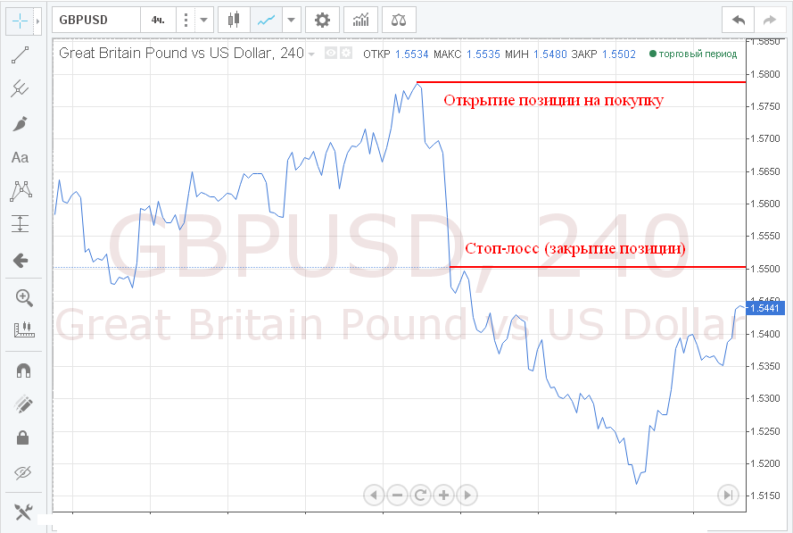 Ситуация: заходим на рынок, открываем график актива GBR/USD, видим картину, очень смахивающую на восходящий тренд, и решаем, что он продлится и дальше, принеся нам прибыль по «лонговой» позиции. Но, подстраховаться, естественно, стоит, поэтому выставим стоп-лосс.