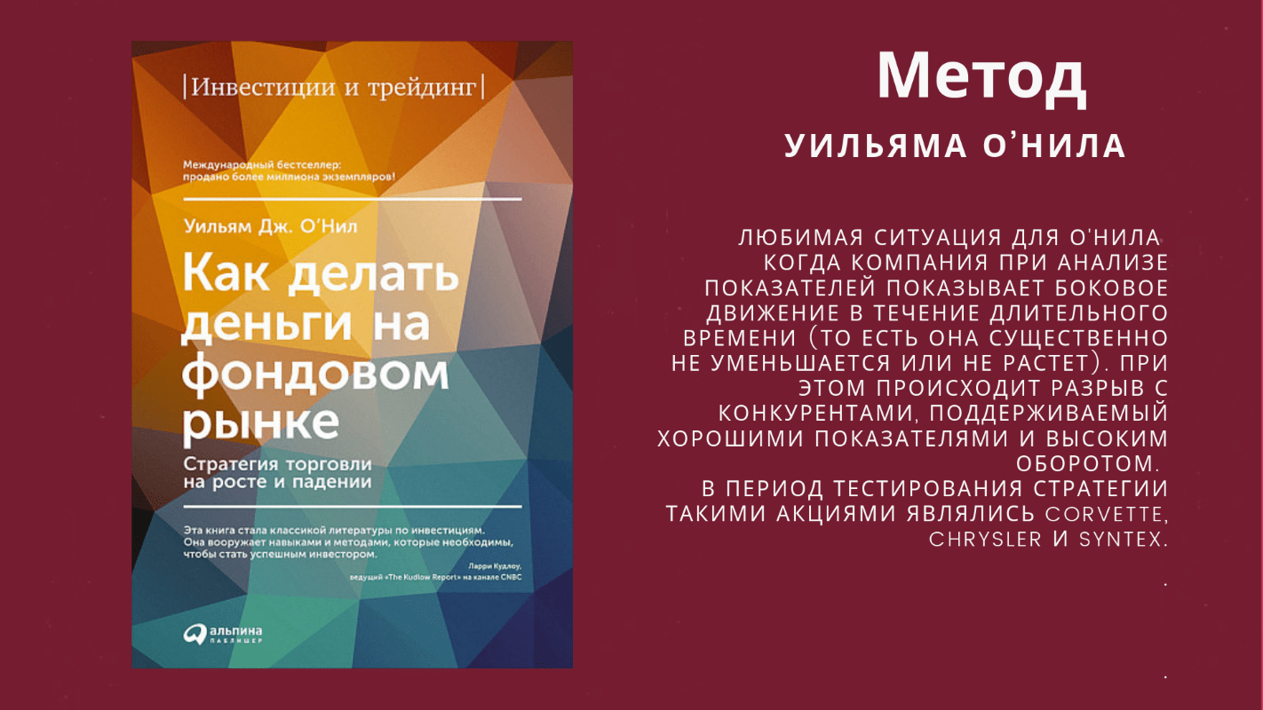 Тем не менее, не следует входить в компании, которые долгое время находились в восходящем тренде, поскольку они имеют тенденцию к снижению.В стратегии инвестирования в акции Уильяма О’Нила нет места для ошибок. Как правило, он продает акции, если они падают более чем на 7% от покупной цены, тем самым минимизируя риска.Главный недостаток этой модели – очень немногие компании соответствуют таким строгим критериям. По оценкам О’Нила, как правило, только 2 процента акций на рынке США доступны для покупки. Но их хватит с лихвой для успешного заработка.