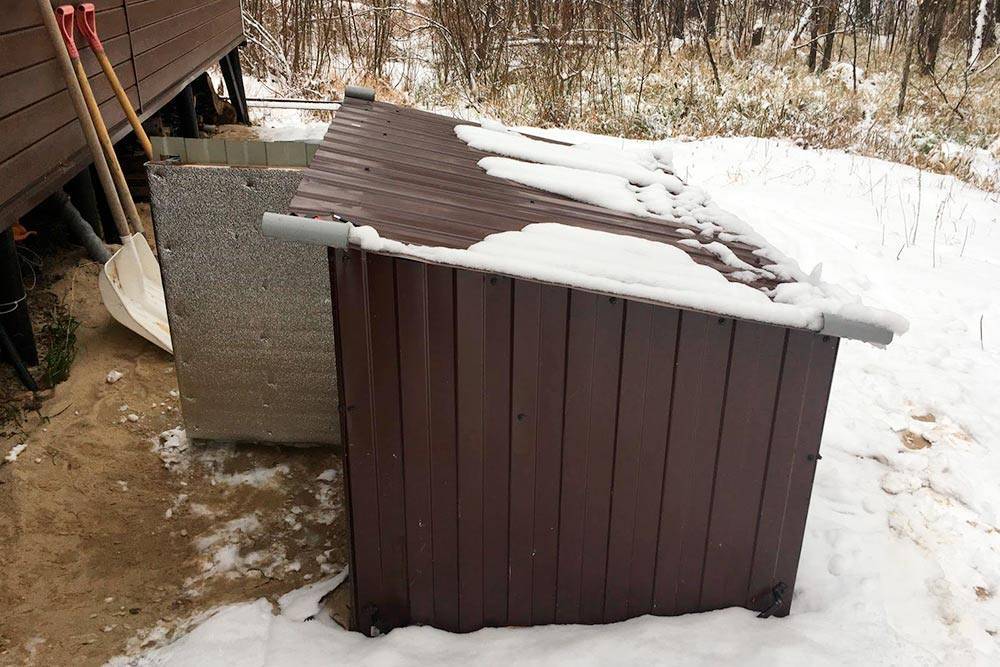 Внутри будки находится насос. Зимой мы размещаем в ней влагостойкий обогреватель, так как она недостаточно теплая, в −20 °C насос может замерзнуть и оставить нас без воды