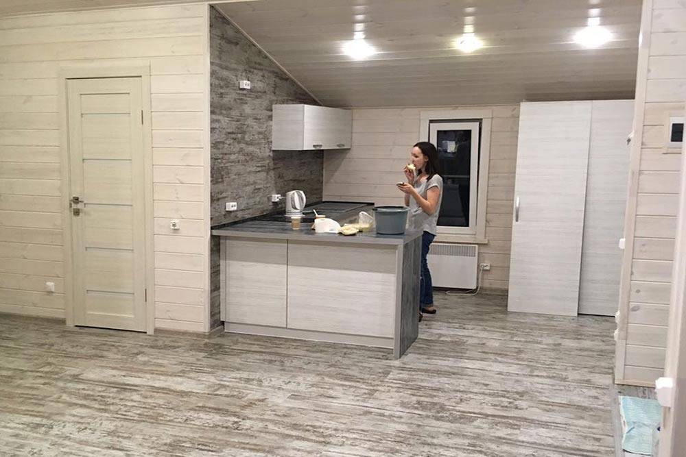 Отделкой занималась та же самая организация, которая строила дом. Для внутренней отделки застройщик нанял стороннюю бригаду. И очевидно, что на ней он решил сэкономить. На первый взгляд получилось светло и современно. Но на самом деле недочетов хватает.