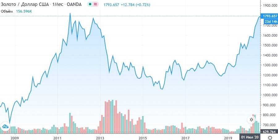 В стабильные времена (2018-2019г.) цены золото по причине слабого спроса находились в районе 1200$ за троицкую унцию.